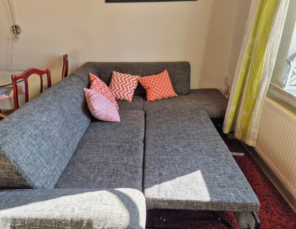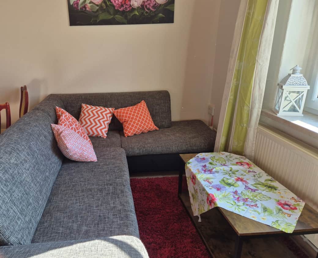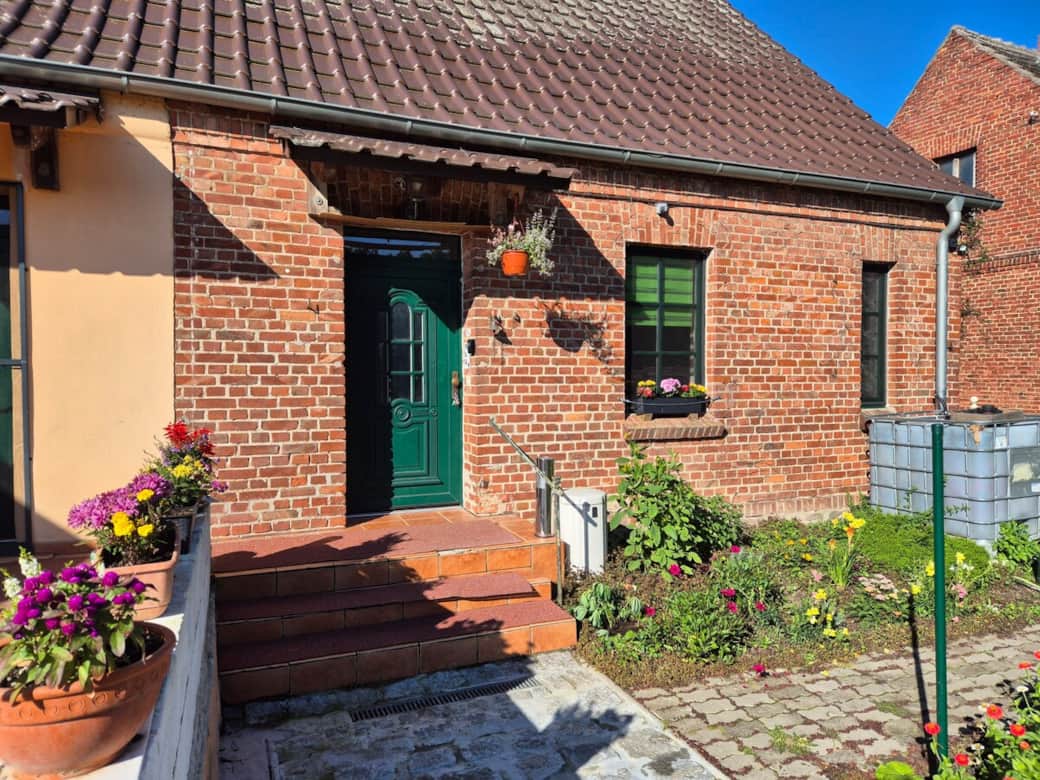Sitzplatz mit Grill vor dem Haus